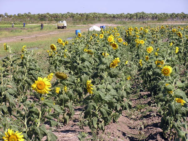 ひまわり栽培 Sunflowers in the research fields. The seeds contain good quality of oil. It is used mainly for cooking while usable as bio-fuel as well. ひまわりは、南米で食用由の主原料です。熱帯では、成長の速さを活かして、他の主要作物の間作として価値があります。 |