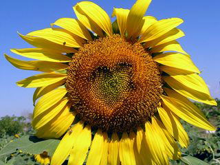 太陽の花 Bright flowers open after only nine weeks of seeding. 強い陽射しを受けて、ぐんぐん伸び、明るい光で思い切り光合成をします。種子が熟すと、花は下を向きます。 無農薬栽培では、害虫を防ぐために、ニームの混植や木酢液の使用が研究中です。今のところ、鳥害は見られません。 |