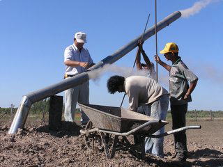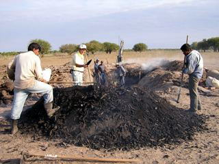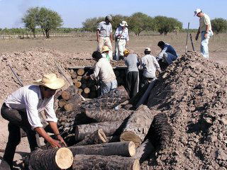 炭焼き準備 Putting palm logs in the underground oven to make carbon for agricultural use. チャコ地方に無尽蔵に自生する、シロロウヤシを有効活用することは夢でしたが、農業用の炭焼きに利用できます。 炭焼き窯は、地面をトラクターで掘っただけのものです。 |