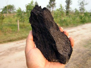 でき上がった炭 Carbon of palm log easily crushed to pieces. It is best for improving agricultural soil. 掘り出した炭は、破砕し、畑の土に混入します。 |