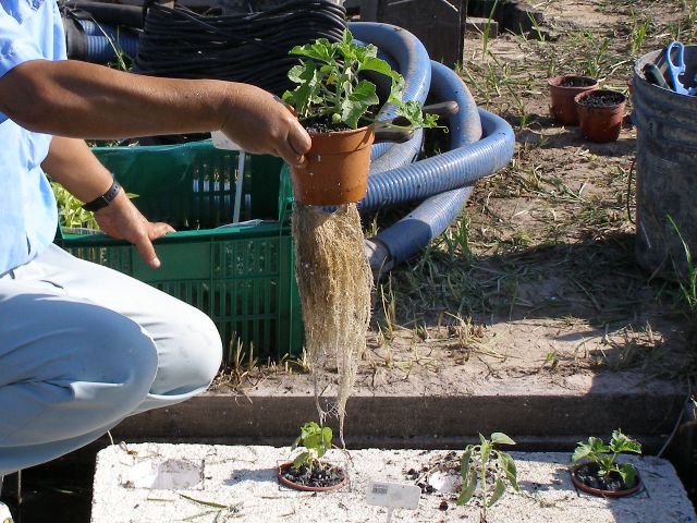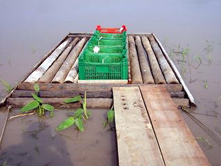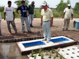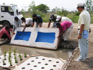 池に浮かべた浮島5号 Floating bed, model 5 試験場の池に浮かべました。さらに改良を重ね、リアチョ(川の入り江、分流、支流など)での栽培実用化を目指しています。 |