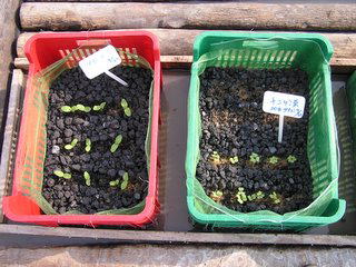 浮島で発芽 Buds of melon(left) and cabbage in the nursery of crop baskets. Carbon instead of soil is used in the floating bed. 浮島の中央に野菜かごがあり、破砕した炭が敷いてあります。 写真右は、チンゲンサイ、左はメロンの育苗箱として使っています。 |