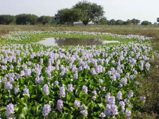 美しいホテイアオイ(アグァペ)の花 Mass of water hyacinth. "Aguape" in Spanish. They come downriver in large or small groups by Northern wind and the stream. Either from close or from far, flowers look charming in translucent bluish purple. They multiply themselves incredibly fast. 日本のホテイアオイよりも大型です。繁殖力が極めて旺盛な上に、上流から浮島のようになって、次々に漂着します。 涼しげな青紫色の花も大型です。 |
