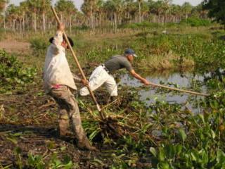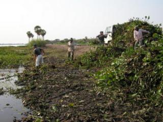 ホテイアオイをトラックに積む Heaps of water hyacinth on the bank. The carrier vehicles run to and from agricultural fields numerous times every day. For the workers, use of a long fork and long boots is a must in order to avoid possible snake-bite. 岸に積み上げたホテイアオイを、トラックが農場に運んで行きます。 蛇が混じっているといけないので、手づかみはご法度です。 |