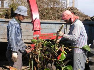 細かく切られたホテイアオイが吹き出る The cutting machine cuts the plants in small pieces and spurt them out. A tractor engine enpowers the machine. トラクターのエンジンが動力源です。 |