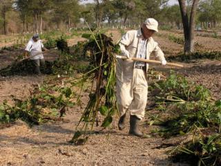 A new machine has arrived at Leda Farm. Enpowered by a tractor motor, it cuts grasses into pieces at uncomparable speed and efficiency to human hand. We can use cut pieces of water hyacinth, or aguape, to make compost of better quality and quantity. Combined with other measures in the context of sustainable development, we can turn infertile soil of Chaco to productive bed for growing various plants including bio-fuel source such as jatropha, custor bean, sugar cane, etc. |