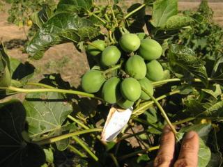 ジャトロファの実 Fruit of jatropha. Each plant is attached with a data card. 開花や結果のデータを取るための札が付けられています。 |