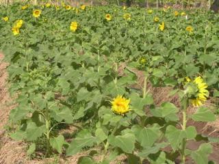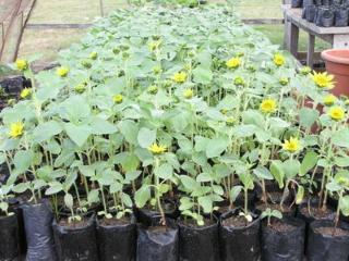 ヒマワリのポット苗 Nursery of sunflower. In July and August, our wintertime, they are almost like dwarfs. 緑肥として使います。 南半球は冬です。 |