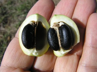 ジャトロファの種子 Seeds of jatropha, each containing three seeds. 実の中には、充実した種子が3粒入っています。 |