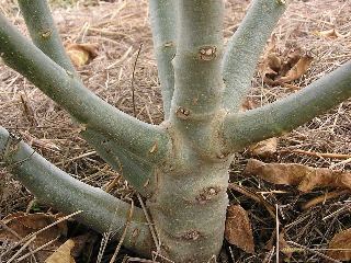 ジャトロファの根元 After six months of final transplanting, the stock has grown to six cm by diametre at the ground level. 定植から6ヶ月で、根元は直径約6cmほどになりました。根元から出る枝もしっかりと太っています。 |