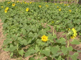 ヒマワリ Two and half months after final transplanting. Sown in autumn, they quickly open flowers. 定植後2ケ月半経過したもの。秋播きにすると、すぐに開花します。 |
