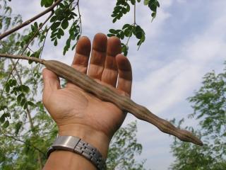 モリンガの実 Fruit of moringa. 種は保存性がよく、ポット苗を作って増殖します。 |