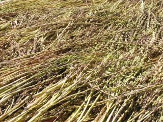 収穫したゴマ Sesame harvested. ゴマは畑である程度熟したら、タイミングよく収穫しないと、種がこぼれてしまいます。 刈り入れ後、天日で乾燥させています。 |