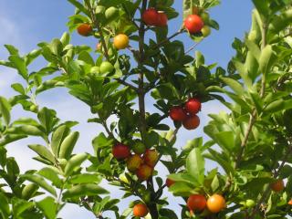 アセローラの実 Fruits of acerola. 甘酸っぱい、ビタミンCの豊富な実です。真っ赤な実は、鳥たちも狙っています。 小さな小鳥は、ついばみます。やや大きめの鳥は、丸呑みにします。 |