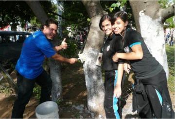 緑はみんなの財産 A whitewash coating for the trees helps protect against insect attack; and the painting is fun! 街路樹を虫害から守るため、水しっくいを塗る。 これって、けっこう面白いぞ。 |