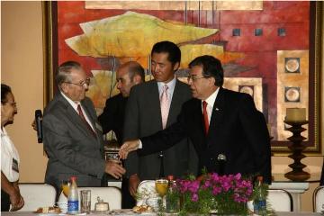 国家元首も平和の大使に Paraguayan President Nicanor Duarte greets former President Rodrigo Carazo of Costa Rica. パラグアイ大統領ニカノール・ドゥアルテ氏と、前コスタリカ大統領ロドリゴ・カラーソ氏。 |