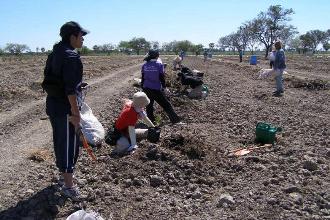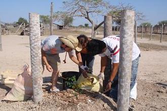 水草でマルチを施す mulching is essential for growing any plant in Chaco. It protects the roots from the scorching sun and pouring rain. 暑い直射日光と激しい風雨から苗木の根本を守るため、マルチは欠かせません。雑草の芽生えを防ぐ効果もあります。地元の子供たちが一緒に働くことで、園芸の技術もしっかり移植されます。 |