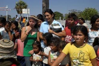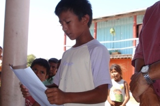 マリア・アウシリアドーラ村にて They give notebooks, pens, strong pants, etc. (Community of Maria Auxiliadora) 開拓民の村の教育環境の貧しさにびっくり。子供たちに文具と衣類をプレゼントし、日本の歌も歌って、心を結んできました。 |
