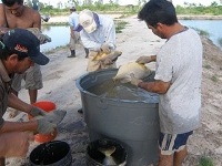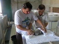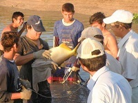 他の養殖場と異なり、レダ基地では透明な水をふんだんに使用することができません。パラグアイ川の水は粘土でにごり、しかも高緯度のために水温も高く、人工孵化にはハンディとなって来ました。しかし、現地スタッフのたゆまぬ努力と熱い情熱とがそれを克服し、推定10万個程度の成熟卵を得ることができ、授精、孵化、養育へと進展しています。